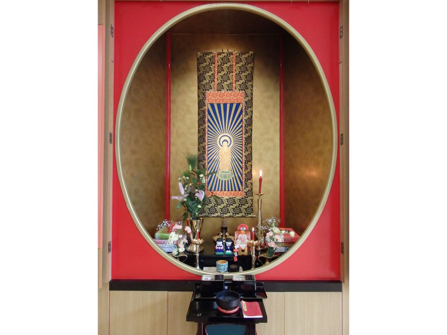 園舎が変わった(平成12年改築)今では遊戯室にあるお内仏の上に揚げられ、子どもたちにいつも変わらず語りかけ、仏様の願いの光を照らし続けています。